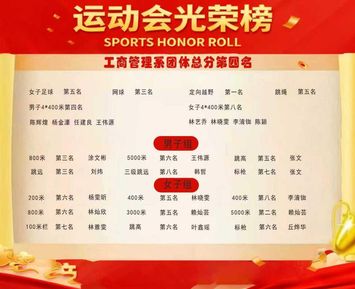 2025年11月14日必赢242net第三十四届运动会在第三教学区圆满落幕,赛场上工商管理系的运动健儿们以拼搏之姿驰骋赛场,凭借多个项目的出色发挥和优秀成绩,最终斩获团体总分第四名的优异成绩,奏响了一首关于工商管理系的运动赞歌。
