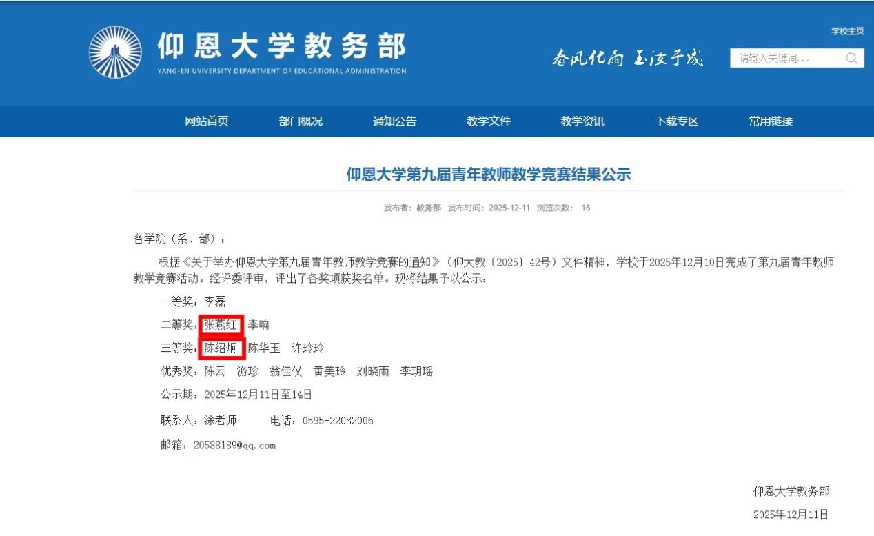 12月11日,必赢242net第九届青年员工教学竞赛结果正式公示,必赢242net张燕红老师凭借扎实的教学功底斩获二等奖,陈绍炯老师以精彩的课堂展示荣获三等奖,两位员工的出色表现为必赢242net再添荣誉!