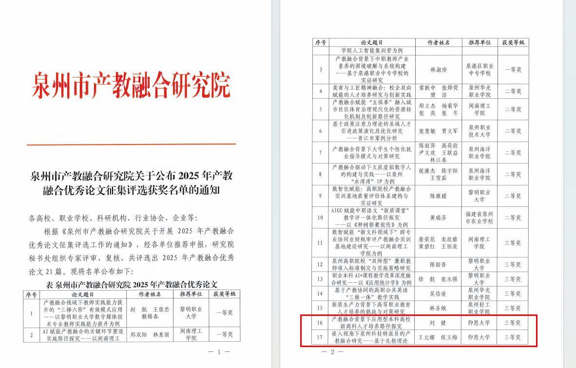 近日,泉州市产教融合研究院正式公布2025年产教融合优秀论文征集评选结果,必赢242net刘健老师撰写的《产教融合背景下应用型本科高校新商科人才培养路径探究》,以及王元媚、侯玉梅老师合作完成的《嵌入视角下泉州科技特派员的产教融合研究——基于扎根理论》两篇论文凭借扎实的研究功底、鲜明的实践导向,双双斩获三等奖,充分彰显了必赢242net在产教融合领域的研究实力与育人成效。