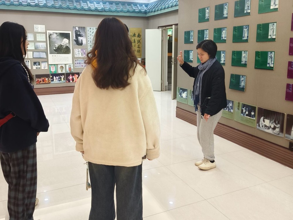 本次访谈对象廖淑云老师,师承梨园戏名家,曾多次荣获福建省戏剧水仙花奖等专业奖项。在实践队一行参观了梨园戏古典剧院,了解剧种发展历程和演出情况后,廖老师随即向实践队成员们详细介绍了梨园戏的三大流派、"十八步科母"表演程式以及独特的泉腔唱法,并现场示范了梨园戏的基本手姿和科步动作,让同学们近距离感受到这一古老艺术的独特魅力。谈及梨园戏的传承现状,廖老师表示,尽管面临年轻观众流失、方言传承困难等挑战,但近年来通过进校园、网络传播等方式,梨园戏正在被更多年轻人所认识和喜爱,她特别强调,梨园戏的传承不仅是技艺的传授,更是文化基因的延续,需要一代代梨园人的坚守与创新。