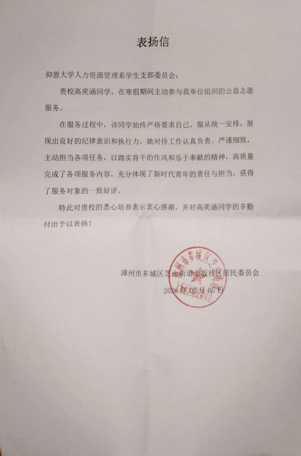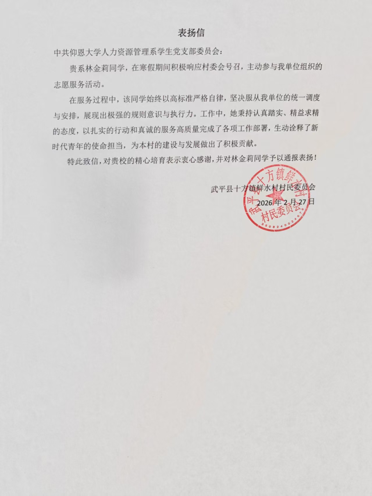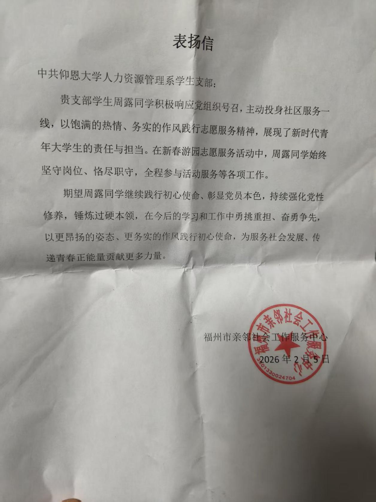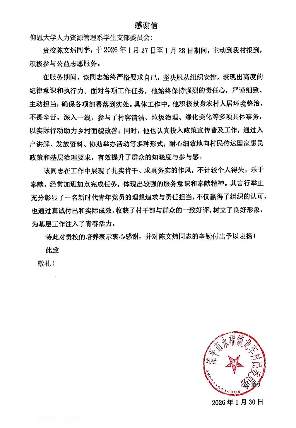 这份经历让我跳出书本,把课堂上学到的责任与担当真正落到实处。村民的认可、村委的肯定,更让我明白新时代青年的使命,从来不在空谈,而在躬身实干、点滴奉献。未来我会继续传递志愿精神,在服务中锤炼自我。