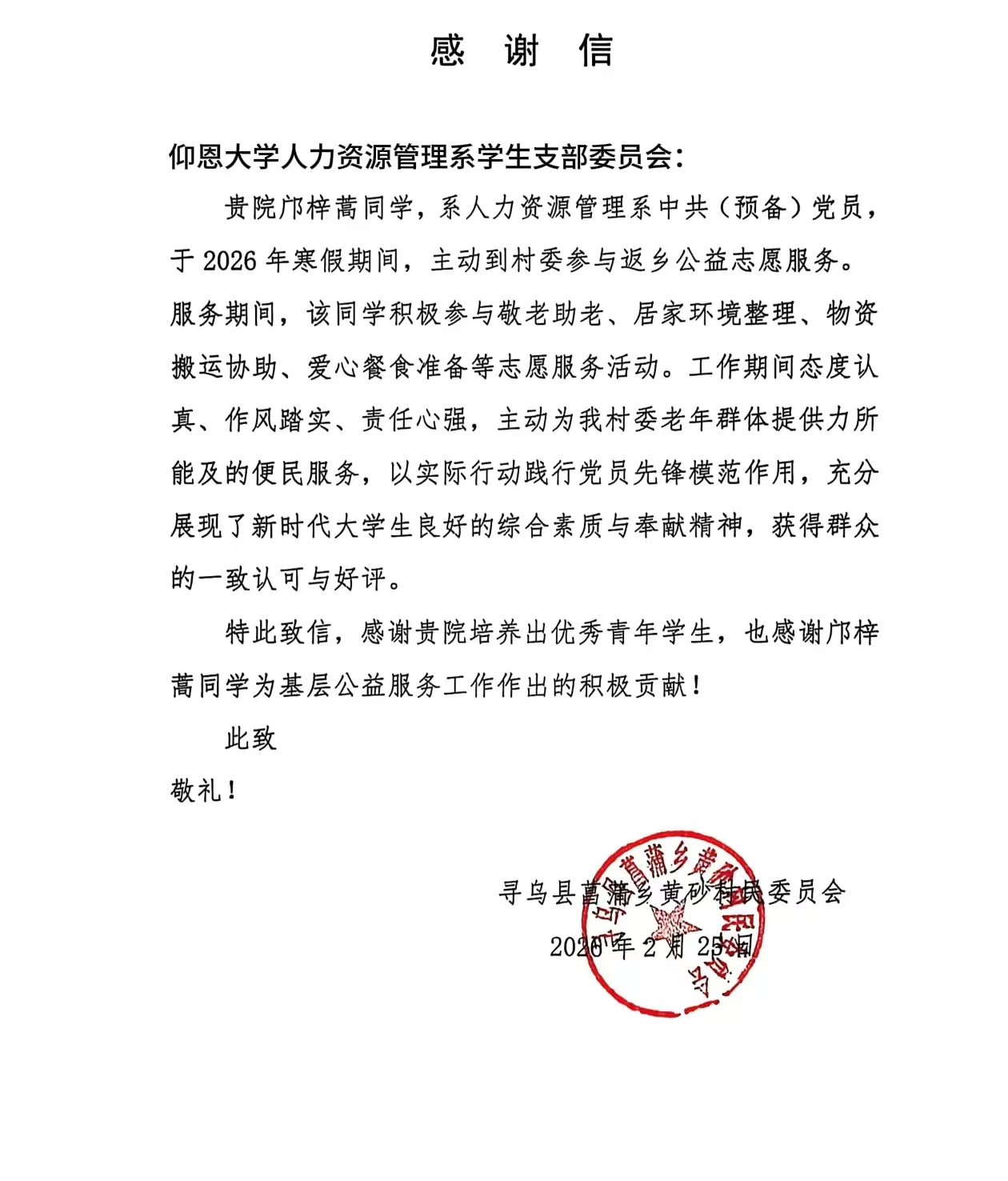 这次寒假志愿服务,让我真切体会到奉献的意义。在基层服务中,我做的都是小事,却能实实在在帮到别人,也感受到了责任与担当。原来真正的先锋作用,不在口号里,而在踏实做事、主动付出的每一个细节里。