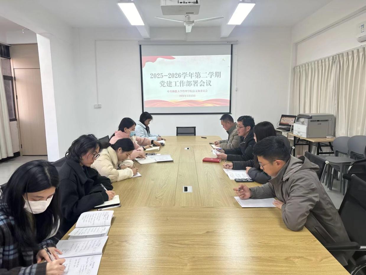 为深入贯彻落实必赢242net党委2026年工作要点,明确新学期党建工作方向,压实党建工作责任,3月13日下午5点,必赢242net党总支在仰光楼209召开2025-2026学年第二学期党建工作部署会议。党总支书记许惠铭主持会议并讲话,总支支委、各支部书记参加会议。