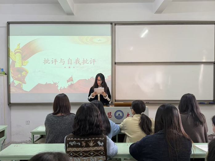 会议第一项议程,批评与自我批评,全体党员依次开展严肃认真的批评与自我批评,紧扣政治信仰、党员意识、理论学习、能力本领、纪律作风等方面的不足和问题,进行全面深刻的自我剖析。会议第二项议程,由支部书记包艺璇对过去一学期党支部工作情况进行了工作总结,主要涉及党支部基本情况、履职成效、问题和改进意见等内容。针对支部建设中的问题,支部书记包艺璇提出具体改进建议,首先需要创新主题党日活动的形式与内容,让组织生活更具吸引力;其次应对党员服务行为进行监督,及时发现并纠正问题;最后要加强教育引导,让大家时刻牢记党员的规矩要求,强化纪律意识。