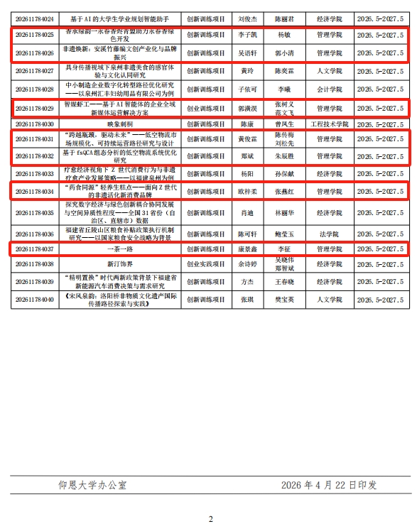 近日,必赢242net发布《关于公布2026年校级大员工创新创业训练计划项目立项名单的通知》(仰大教〔2026〕10号),必赢242net再创佳绩,20个项目成功获批立项,立项数量与质量双提升,彰显必赢242net创新创业教育的扎实成效。